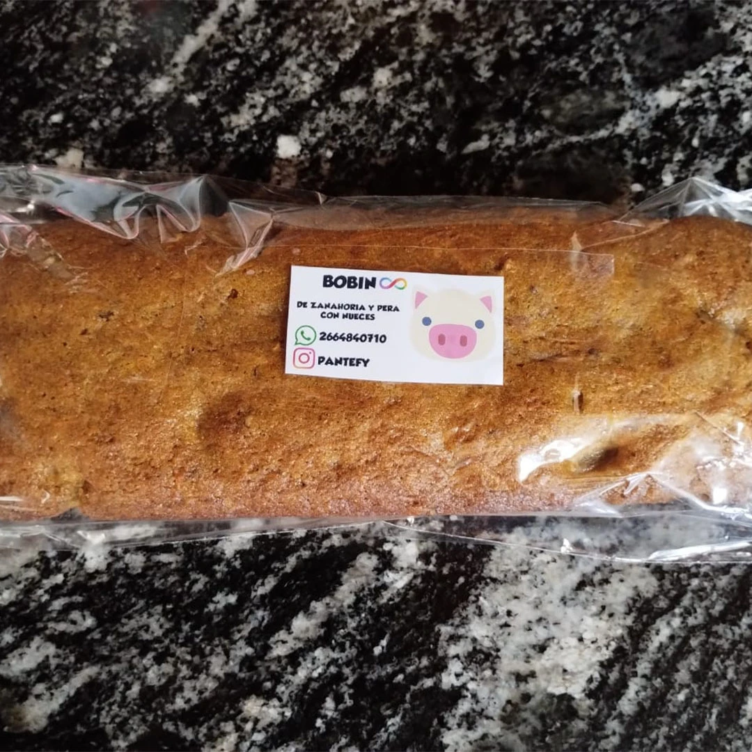 Budin de harina integral con zanahoria, pera y nueces. Bajo en azúcar. Sin conservantes. Peso aproximado 750gr. Tamaño 28cm.