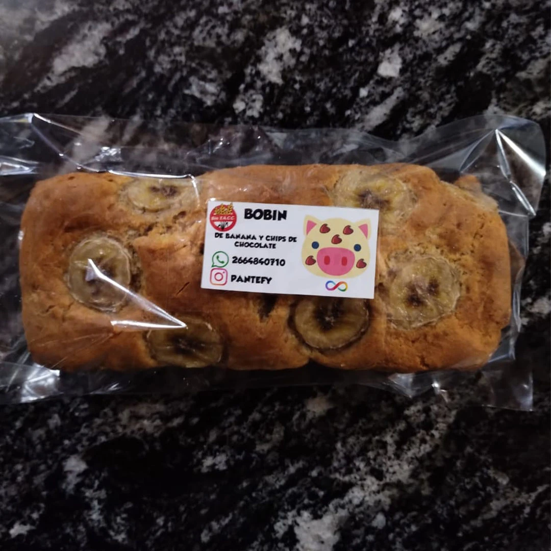 Budín elaborado con premezcla sin tacc, banana y chips de chocolate semi amargo. Bajo en azúcar, sin conservantes. Peso aproximado 450gr. Tamaño 20cm.