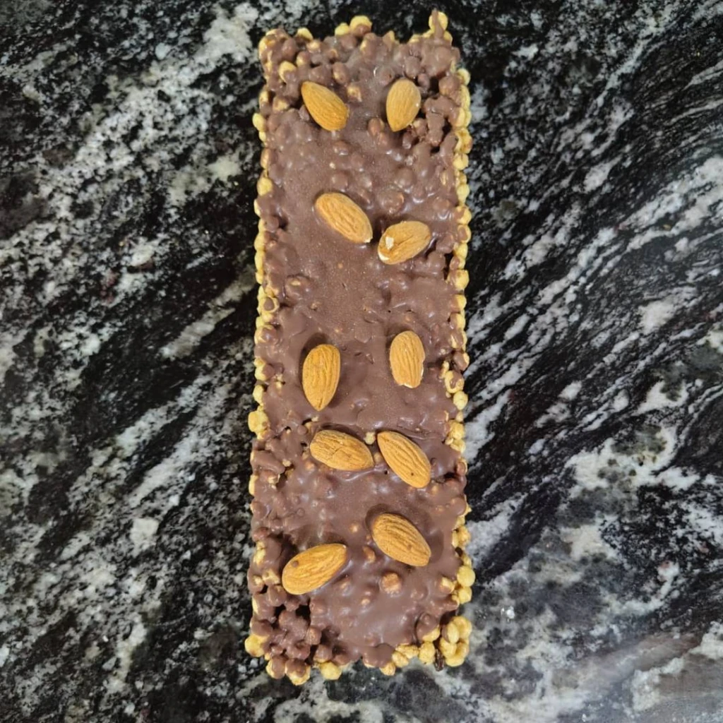 Ingredientes: Quinoa pop, pasta de mani natural, chocolate al 70%, almendras, castañas de cajú, miel, chocolate semi amargo.