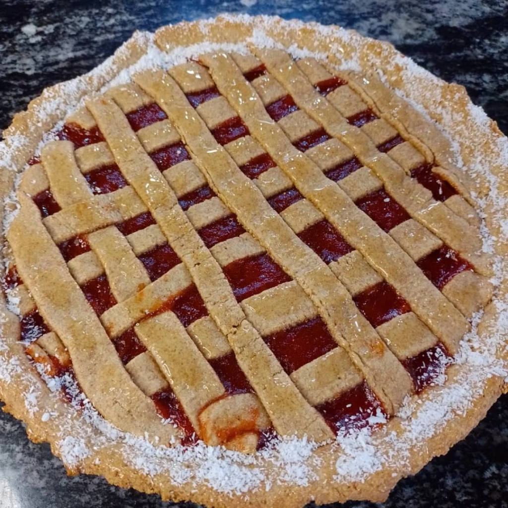 pastafrola de harina integral con membrillo. Baja en azúcar. Sin manteca y sin lactosa. Tamaño 28cm y peso aprox. 850gr.