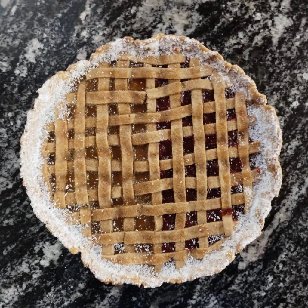 pastafrola de harina integral con batata y membrillo. Baja en azúcar. Sin manteca y sin lactosa. Tamaño 28cm y peso aprox. 850gr.